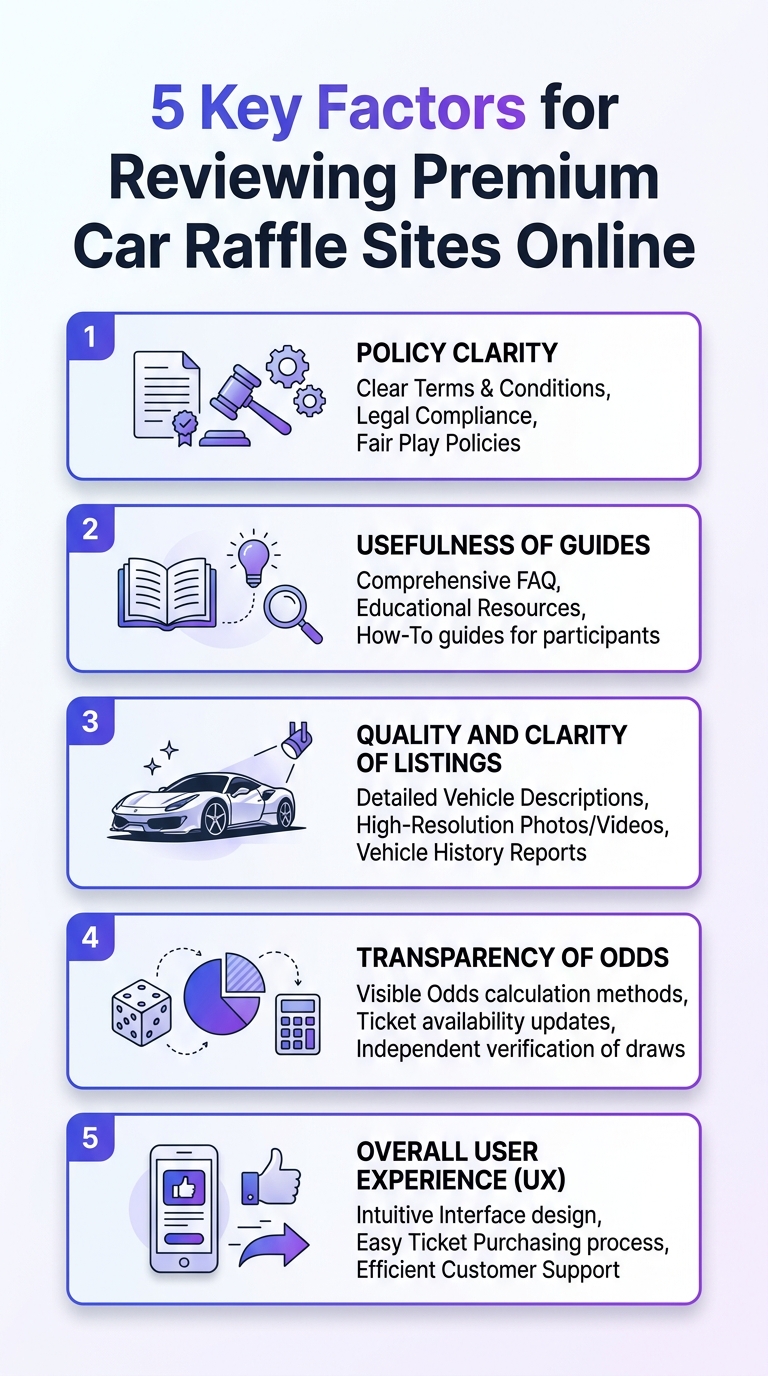 This infographic highlights five key factors to consider when evaluating premium car raffle sites online.